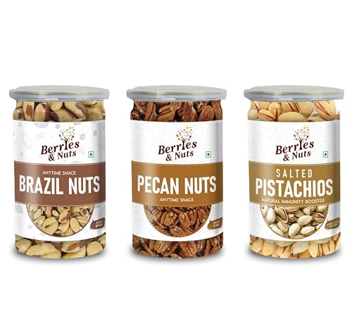 Brazil nuts have a high proportion of monounsaturated fat which is a good fat but they also contain some protein as well as being a good source of important nutrients including magnesium zinc calcium vitamin E and some B vitamins.They are very High in Selenium Contents. Pecan nuts are with exceptional quality and freshness. They are handpicked mammoth pecans from usa. Pecans are rich source of fibre and proteins which increases metabolism. These roasted and salted pistachios are so yummy and delightful that it will tingle your taste buds wanting for more. They are packed in air tight packages so you dont compromise with the tast.