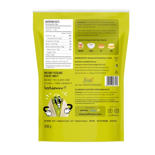 Premium Quality Roasted Pista: Zoff brings you roasted pista 250gm that is perfectly salted and roasted to preserve its rich flavor and irresistible crunch. These premium pista nuts are a treat for your taste buds and a boost for your nutrition.