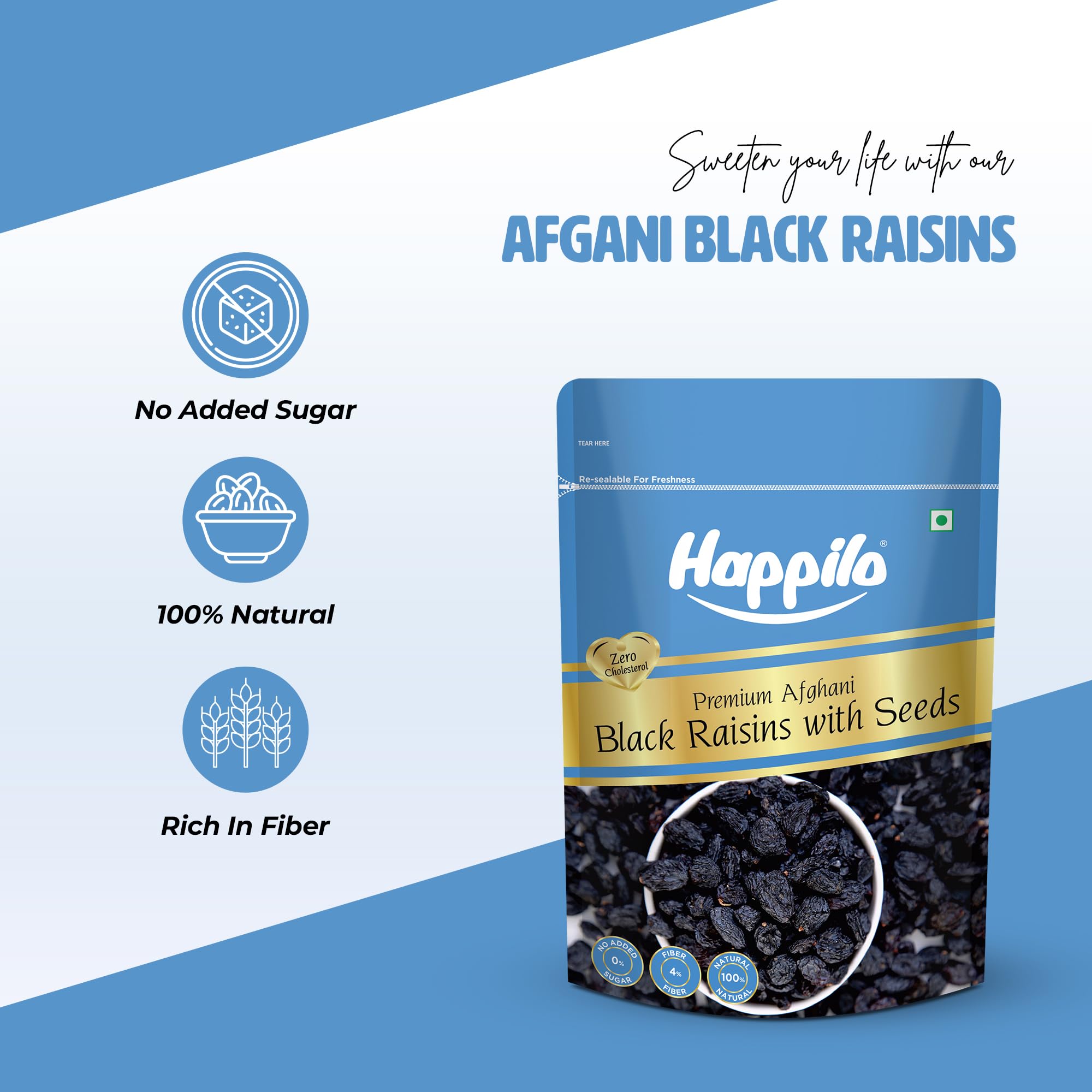Happilo's Afghani Black Raisins are perfect for those with dietary restrictions as they are gluten-free and contain no cholesterol. This makes them an excellent choice for a wholesome snack whether you're at home at work or on the go. But the benefits of these raisins go beyond their nutritional value. Their versatile nature allows you to use them in various recipes or simply savor them as a stand-alone snack. Add a touch of natural sweetness to your life with Happilo Premium Afghani Black Raisins and elevate your taste and health experience today