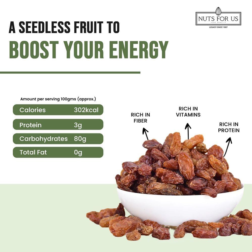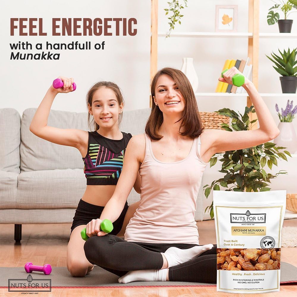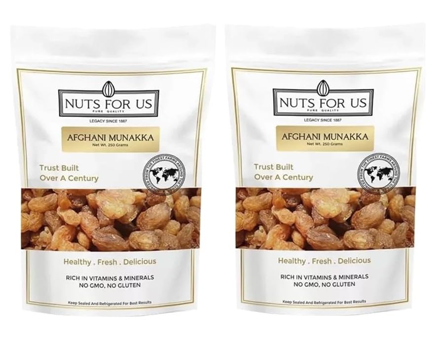 Nuts for Us Afghani Munakka also known as Afghan raisins. Packed in a pack of 2 250g bag these large king-size dried grapes are cultivated in Afghanistan and are a powerhouse of nutrients. Rich in energy fiber vitamins and minerals including iron and potassium these raisins make a wholesome addition to your diet. Traditionally sun-dried Afghani Munakka retains its natural sweetness and health benefits making it an excellent choice for cooking baking or simply snacking. Enjoy them as a healthy treat or add them to your favorite recipes for an extra boost of flavor and nutrition!