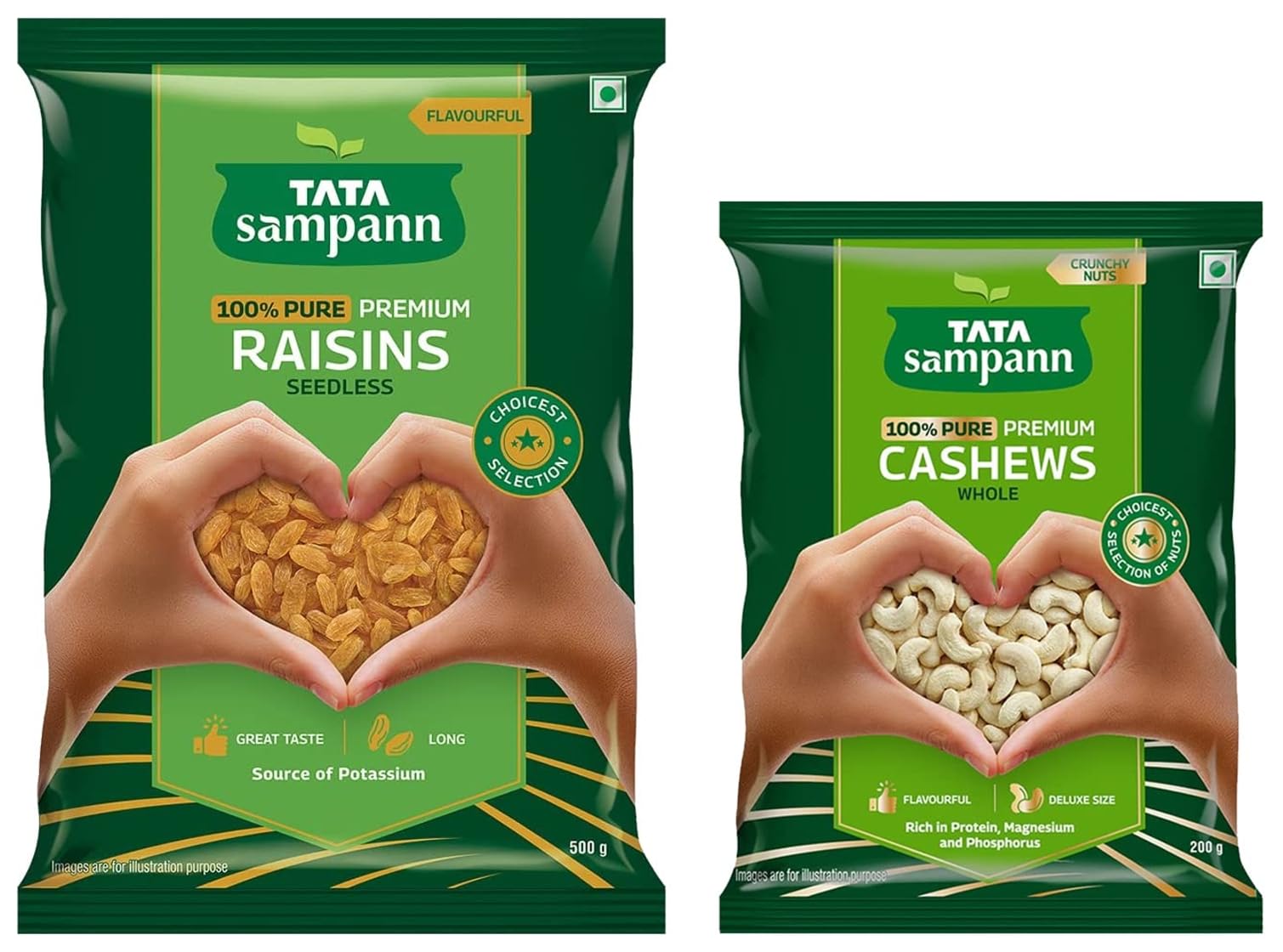 Tata Sampann Pure Cashews Whole | Premium Kaju | Rich in Protein Magnesium and Phosphorus | Premium Nuts & Dry Fruits | 200gTata Sampann 100% Pure Premium Cashews Tata Sampann brings you a whole range of premium dry fruits nuts and raisins for a wholesome snacking experience. Made from the choicest selection of nuts Tata Sampann 100% Pure Premium Cashews are worth savouring. Tata Sampann dry fruits go through up to 20 quality parameters to deliver the choicest selection of nuts. Good choice for your well-being Packed with the goodness of protein magnesium and phosphorus Tata Sampann kaju are a good choice for your well-being. Rich in protein magnesium and phosphorus all of which contribute to maintenance of normal bones. So satiate yourself guilt-free with this fulfilling snack or share it with your loved ones. Happy snacking! Turn your snack time delicious and wholesome with these crunchy and flavourful nuts. They are perfect to curb your hunger in between meals and make for a great addition to your diet. Add these cashews to your cooking practices and upgrade your favourite dishes to yummy delights. Tata Sampann Pure Raisins Seedless | Premium Kishmish | Source of Potassium | Premium Dry Fruits | 500g Value PackTata Sampann 100% Pure Premium Raisins Tata Sampann brings you a whole range of premium dry fruits nuts and raisins for a wholesome snacking experience. Made from the choicest selection Tata Sampann 100% Pure Premium Raisins are worth savouring. Tata Sampann dry fruits go through up to 20 quality parameters to deliver the choicest selection of nuts and raisins. Good choice for your well-being Packed with the goodness of potassium Tata Sampann kishmish are a good choice for your well-being. Tata Sampann raisins are a source of potassium which is known to contribute to the maintenance of normal blood pressure. So satiate yourself guilt-free with this fulfilling snack or share it with your loved ones. Happy snacking! Turn your snack time delicious and wholesome with these flavourful raisins. They are perfect to curb your hunger in between meals and make for a great addition to your diet. Add these raisins to your cooking practices and upgrade your favourite dishes to yummy delights.