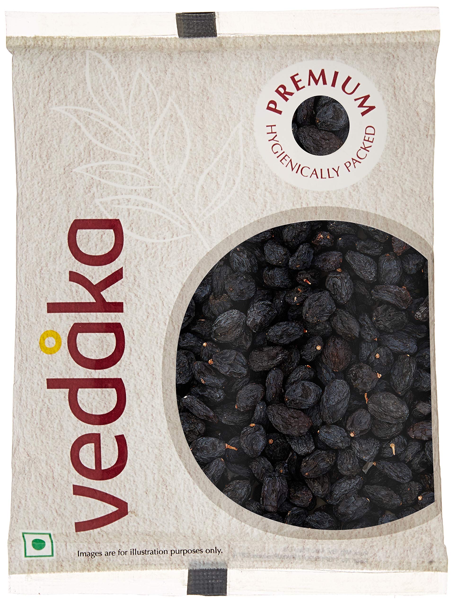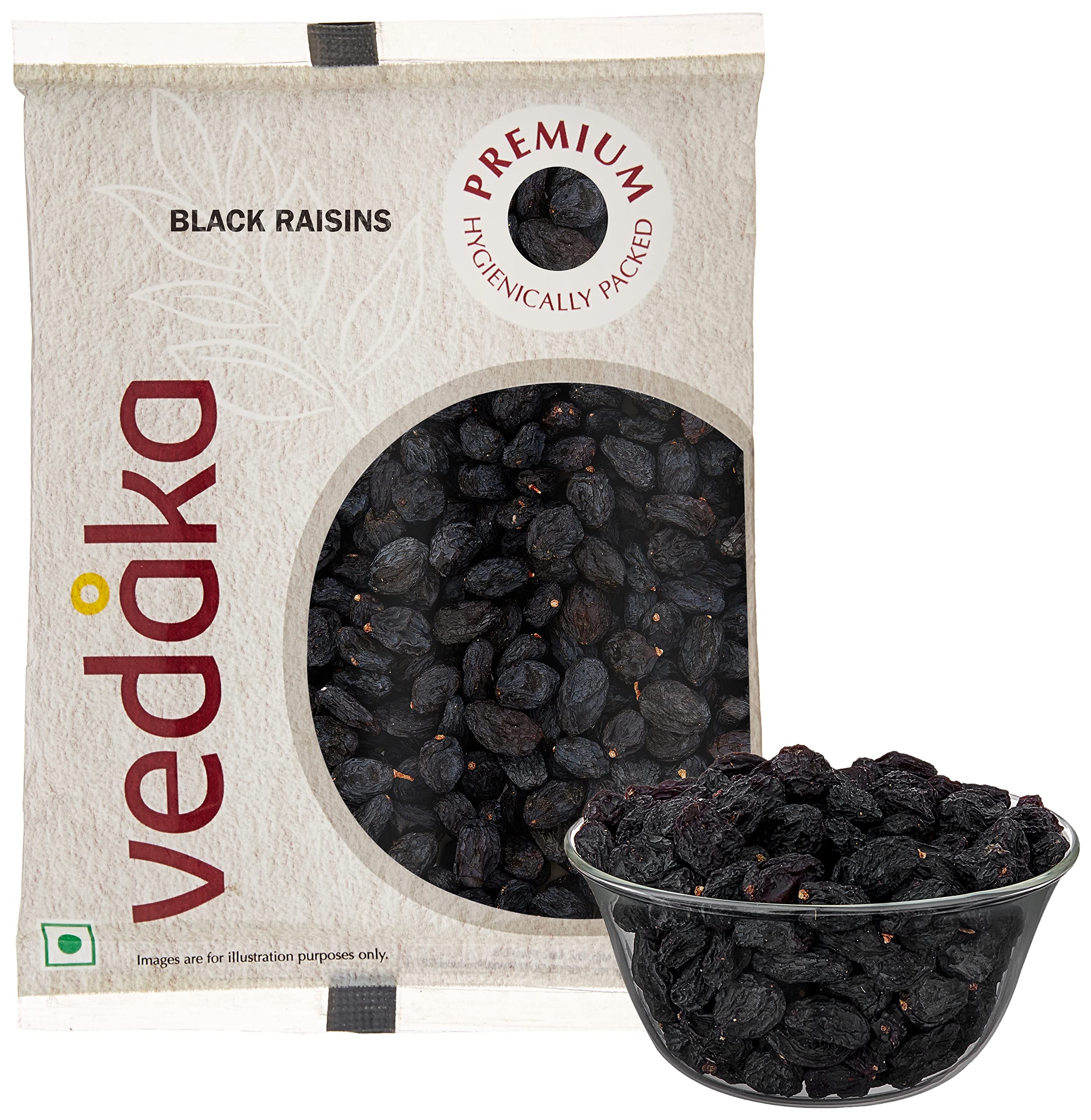 Vedaka brings to you -quality black raisins with a sweet fruity taste and a soft chewy texture. They are packed in a food-safe polybag to keep them safe in the journey to your home. These raisins are packed in an integrated nuts and dried fruits unit and may contain occasional traces of other nuts and dried fruits. May contain an occasional stem or stalk store in a cool dry place in an airtight container and preferably refrigerate after opening.