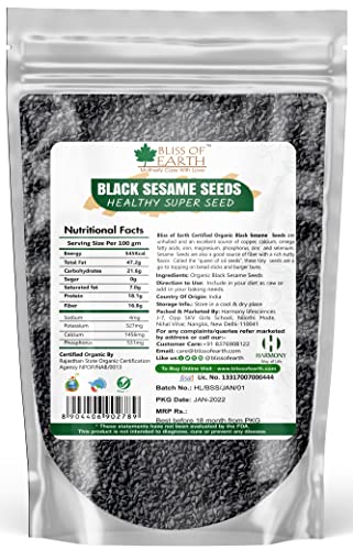 Bliss of Earth Certified Organic Black Sesame Seeds are unhulled and an excellent source of copper calcium omega fatty acids iron magnesium phosphorus zinc and selenium sesame seeds are also a good source of fiber with a rich nutty flavor. called the "queen of oil Seeds" these tiny seeds are a go-to topping on bread sticks and burger buns.