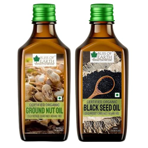 Bliss of Earth Organic Groundnut Oil is extracted by cold pressing of groundnuts without using hexane. It is rich in nutrients vitamins and poly-unsaturated fats. It is also effective in decreasing cholesterol and good for hormonal activities. Like other plant-based oils groundnut oil contains no cholesterol. Groundnut oil is sometimes applied directly to the skin for joint pain dry skin and other skin conditions Bliss of Earth organic Kalonji Oil (Black Cumin Seed Oil) is a premium quality 100% pure 100% organic unrefined virgin & cold pressed oil. It is extracted from the seeds of organic black cumin. It is a rich source of essential fatty acids and also contains two very powerful compounds Nigellone an anti-histamine and Thymoquinone an anti-inflammatory along with other nutrients that work synergistically to support the body's various functions.