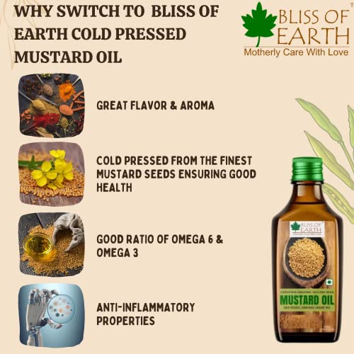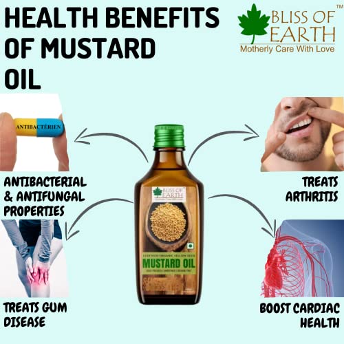 Bliss of Earth Certified Organic Yellow Mustard oil is extracted by cold pressing of yellow mustard seeds without using hexane. It's rich in nutrients & vitamins .It also helps in fighting bacterial infection in colon intestines and digestive tract.