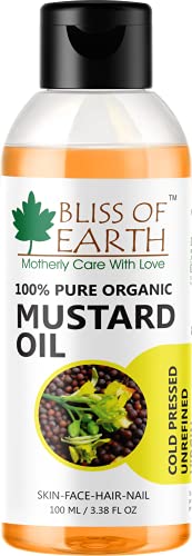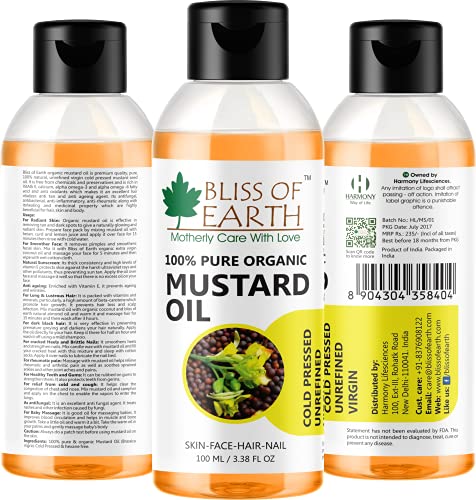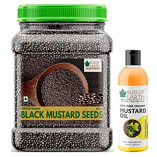 Bliss Of Earth: Certified Black Mustard Seeds are one of the main ingredients used in indian kitchen. it can be used whole or ground fresh before cooking. it can also be used for chutney pickles or with other indian spices for a homemade curry spice blend. Bliss of Earth organic mustard oil is premium quality pure 100% natural unrefined virgin cold pressed mustard seed oil. It is free from chemicals and preservatives and is rich in Vit A & E calcium alpha omega-3 and alpha omega -6 fatty acid and anti oxidants which makes it an excellent hair vitalizer anti tan. Its antifungal antibacterial anti-inflammatory along with its healing and medicinal property which are highly beneficial for hair skin and body. For Smoother Face: It removes pimples and smoothens facial skin. Mix it with Bliss of Earth organic extra virgin coconut oil and massage your face for 5 minutes and then wipe with wet cotton cloth.For Long & Lustrous Hair: It is packed with vitamins and minerals particularly a high amount of beta-carotene which promote hair. It prevents scalp infection. Mix mustard oil with organic coconut and bliss of earth natural almond oil and warm it and massage hair for 15 minutes and then wash after 3 hours.For dark black hair: It is very effective in darkens your hair naturally. Apply the oil directly to your hair. Keep it there for half an hour and wash it off using Bliss of Earth Witch Hazel shampoo.For cracked Heels and Brittle Nails: It smoothens heels and strengthen nails. Mix candle wax with mustard oil and fill your cracked heel with this mixture and sleep with cotton socks. Apply it over nails to lubricate the nail bed.For Baby Massage: It is good oil for massaging babies. It improves blood circulation and helps in muscle