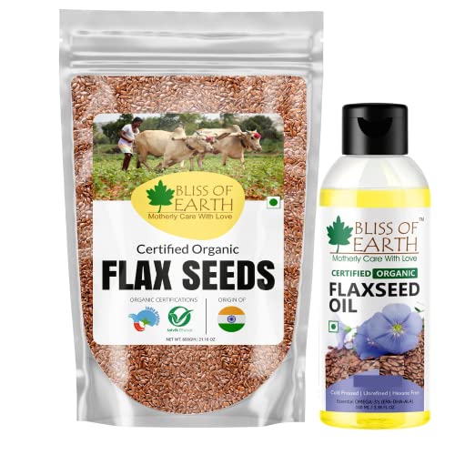 Bliss of Earth Combo Of Organic Raw Flax Seeds (600gm) For Eating and Weight Loss And Organic Flaxseed Oil (100ml) For Immune Support, Healthy Hair & Skin| Haxene Free| Pack Of 2
