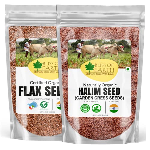 Bliss of Earth Certified Organic Flax Seeds popularly known as Alsi is one of the popular health food due to its high content of hearth healthy OMEGA-3 fats fiber and other plant compounds. It offers many health benefits such as improved digestion and reduced risk of heart disease. Bliss of Earth Naturally Organic Halim seeds also known as Haleem or Aliv are garden cress seeds loaded with many health benefits and nutritional qualities. These seeds were considered as an important nutritional and medicinal plant in India since the Vedic era (between 500? 1700) B.C. Halim Seeds are good source of protein fiber phenolic acids and so many nutritional compounds and considered as a âfunctional foodsâ that promote overall health and well-being while keeping diseases at bay apart from providing nutrition.