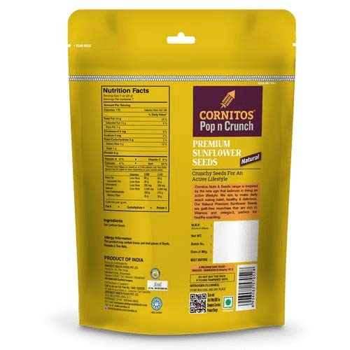 Cornitos Salted Roasted Sunflower Seeds are enriched with zinc and magnesium which pack on energy for an active life without compromising on taste for health. These are available in an easy-to-open and re-sealable stand up packs. They lock in freshness and deliver great taste. Its functional design makes it an ideal travel as well as a party pack with the goodness of health.