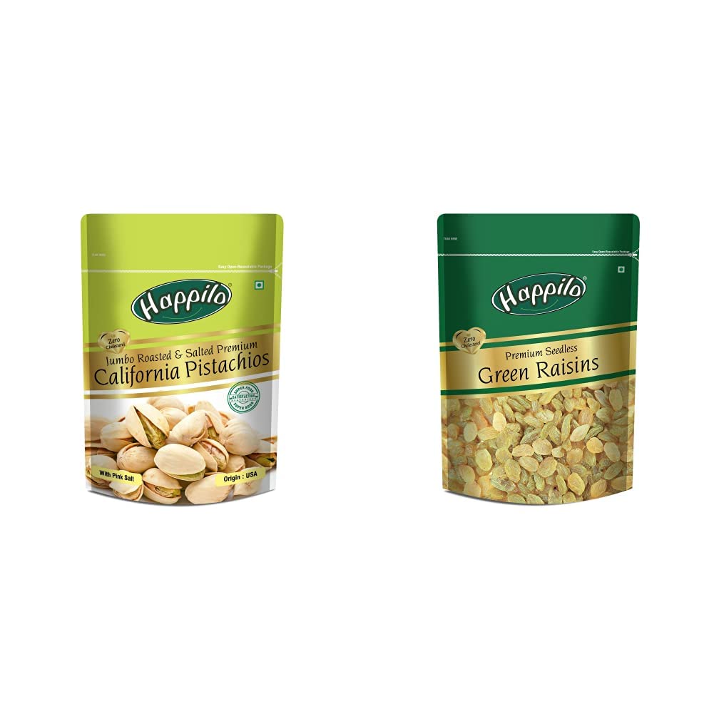 Happilo Premium Californian Roasted and Salted Pistachios 200gPistachios are a wonderful fun & Tasty snack which are lightly salted. Crack open the shells to treat your taste buds for a snacking sensation.Happilo Premium Seedless Green Raisins 250gRaisins are the original candy- nature's candy. They are one of the most nutritious dried fruits in the world. famous for their sweetness so they're a yummy healthy snack. These are out of this world. They have double the deliciousness of ordinary raisins. Great for snacking adding to cereal cooking and baking.
