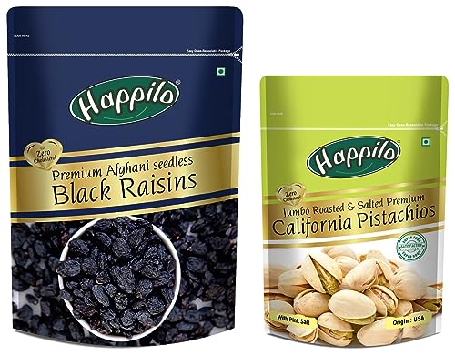 Happilo Premium California Roasted & Salted Pistachios 200 g | Pista Dry Fruit | Tasty & Healthy | High in Protein & Dietary Fiber | Gluten Free & Low Calorie NutsHappilo has travelled the world to get the finest gourmet dry fruits dried fruits nuts berries and dates. Indulge into the gourmet and grocery world of Happily with awesome natural nuts and dry fruits along with the unique dry fruit mixes fusions and flavoured dry fruits healthy seeds and dried berries specially crafted for your taste and health.Happilo Premium Afghani Seedless Black Raisins 250 g | Kali Kishmish | Munakka Dry Fruits | Delicious & Healthy SnackHappilo has travelled the world to get the finest gourmet dry fruits. They are one of the most nutritious dried fruits in the world they're a yummy healthy snack. Great for Snacking adding to Cereal Cooking and Baking. High Antioxidants Dietary Fiber No Gluten Non GMO Zero Trans Fat & Zero Cholesterol. Daily need products for a healthy and energetic life. Happilo Zip Lock Pouch with airtight seal to ensure the product is protected and fresh. Quality assured - Happilo products are rigorously tested against the industry's best quality standards.