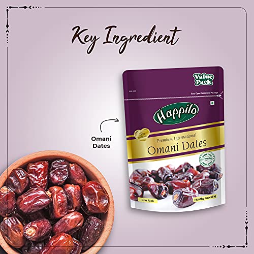 Happilo Premium International Omani Dates 680g Value Pack | Khajoor or Khajur Dry Fruit | Healthy & Nutritious Snack | Rich in Protein & Vitamins | Natural SweetnerHappilo omani dates also known as khajoor are one of worlds most delicious farm fresh dates. Omani dates have the hidden quality of boosting energy instantly! Hence they are not just apt during festive season but are also a must-have snack for the entire year. It is superfood for super energy levels. Our products are packed under highest level of hygiene retaining all the goodness of nature.Happilo Premium Afghani Seedless Black Raisins 250 g | Kali Kishmish | Munakka Dry Fruits | Delicious & Healthy SnackHappilo has travelled the world to get the finest gourmet dry fruits. They are one of the most nutritious dried fruits in the world they're a yummy healthy snack. Great for Snacking adding to Cereal Cooking and Baking. High Antioxidants Dietary Fiber No Gluten Non GMO Zero Trans Fat & Zero Cholesterol. Daily need products for a healthy and energetic life. Happilo Zip Lock Pouch with airtight seal to ensure the product is protected and fresh. Quality assured - Happilo products are rigorously tested against the industry's best quality standards.