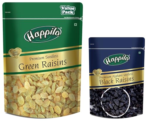 Happilo Premium Seedless Green Raisins 500g Value Pack| Kishmish | Nutritious| Rich in IronHappilo has travelled the world to get the finest gourmet dry fruits. They are one of the most nutritious dried fruits in the world they're a yummy healthy snack. Great for Snacking adding to Cereal Cooking and Baking. High Antioxidants Dietary Fiber No Gluten Non GMO Zero Trans Fat & Zero Cholesterol. Daily need products for a healthy and energetic life. Happilo Zip Lock Pouch with airtight seal to ensure the product is protected and fresh. Quality assured - Happilo products are rigorously tested against the industry's best quality standards.Happilo Premium Afghani Seedless Black Raisins 250 g | Kali Kishmish | Munakka Dry Fruits | Delicious & Healthy SnackHappilo has travelled the world to get the finest gourmet dry fruits. They are one of the most nutritious dried fruits in the world they're a yummy healthy snack. Great for Snacking adding to Cereal Cooking and Baking. High Antioxidants Dietary Fiber No Gluten Non GMO Zero Trans Fat & Zero Cholesterol. Daily need products for a healthy and energetic life. Happilo Zip Lock Pouch with airtight seal to ensure the product is protected and fresh. Quality assured - Happilo products are rigorously tested against the industry's best quality standards.