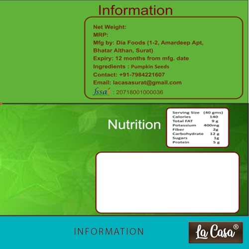 LA CASA PUMPKIN SEEDS ARE A GOOD SOURCE OF ANTIOXIDANTSMAGNESIUMZINC AND FATTY ACIDS - ALL OF WHICH MAY HELP KEEP YOUR HEART HEALTHY.IT REDUCES HIGH BLOOD PRESSURE AND HIGH CHOLESTEROL LEVELS. They are a rich source of healthy fats & packed with dietary fibre keeping you full for longer duration & can help in weight loss. They help you get refreshed and energetic. It's convenient packing maintain the seeds freshness and quality providing a long lasting nutrient-dense snack option for anytime enjoyment whether at home or on the go.