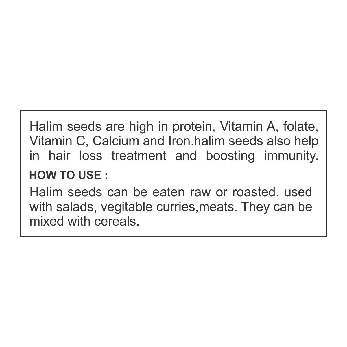 Halim seeds are high in protein Vitamin A folate Vitamin C Calcium and Iron.halim seeds also help in hair loss treatment and boosting immunity.