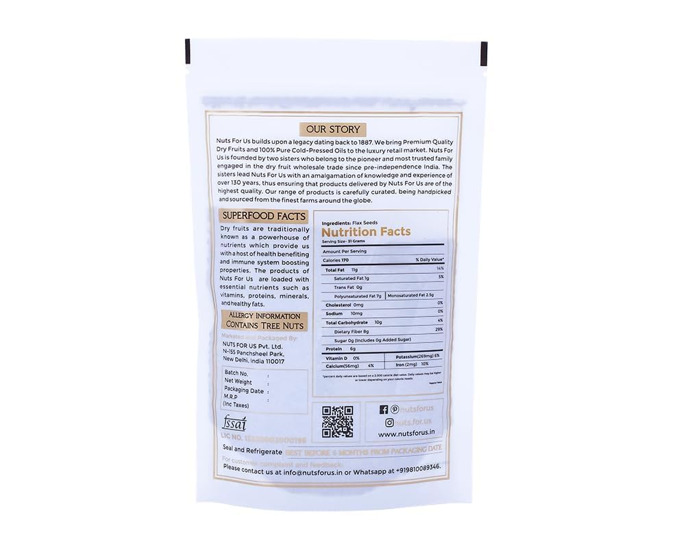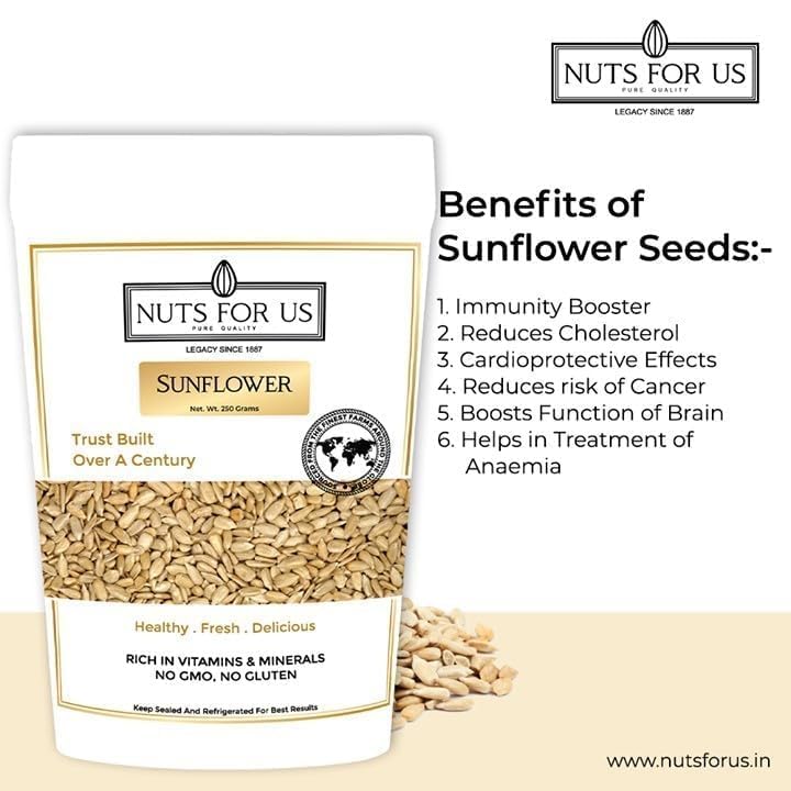 Nuts for Us Chia Seeds sourced from the finest chia plants our 250-gram blend of white and golden chia seeds is designed to elevate your health and wellness. Each batch is meticulously selected and undergoes rigorous quality control to ensure you receive only the freshest most flavorful seeds. Packed with essential nutrients our chia seeds are a rich source of omega-3 fatty acids fiber protein vitamins and minerals. They support heart health enhance digestion and boost energy levels making them a perfect addition to your daily diet. The unique combination of white and golden chia seeds offers a delightful variety in texture and tasteenjoy the subtly nutty flavor of white chia or the mild sweetness of golden chia. Nuts for Us Raw Pumpkin Seeds our 250g package features unroasted pumpkin seeds packed with essential proteins vitamins and minerals that support overall health. These tiny green seeds are rich in iron zinc and magnesium making them an excellent addition to your diet. Loaded with omega-3 and omega-6 fatty acids our pumpkin seeds are not only delicious but also beneficial for heart health and reducing inflammation. The high magnesium content promotes strong bones and supports healthy bone structure while the dietary fiber helps maintain weight by keeping you feeling full longer and curbing unnecessary cravings. Nuts for Us Flax Seeds our premium 250-gram blend of white and golden flax seeds is packed with essential nutrients that promote overall health. Sourced from the finest flax plants each batch is carefully selected to ensure superior taste freshness and quality. Flax seeds are a powerhouse of nutrition rich in omega-3 fatty acids fiber protein and a variety of vitamins and minerals. These nutrient-dense seeds support heart health improve digestion and help maintain balanced energy levels throughout the day. With their delightful nutty flavor our flax seeds are perfect for enhancing smoothies oatmeal baked goods and salads. Nuts for Us Chia Seeds sourced from the finest chia plants our 250-gram blend of white and golden chia seeds is designed to elevate your health and wellness. Each batch is meticulously selected and undergoes rigorous quality control to ensure you receive only the freshest most flavorful seeds. Packed with essential nutrients our chia seeds are a rich source of omega-3 fatty acids fiber protein vitamins and minerals. They support heart health enhance digestion and boost energy levels making them a perfect addition to your daily diet. The unique combination of white and golden chia seeds offers a delightful variety in texture and tasteenjoy the subtly nutty flavor of white chia or the mild sweetness of golden chia. Nuts for Us Sunflower Seeds 250-gram premium sunflower seeds is bursting with essential vitamins minerals and nutrients that provide a plethora of health benefits. These seeds are rich in vitamin E magnesium selenium and other vital nutrients that support overall well-being and contribute to a healthy lifestyle. Sourced from non-GMO pla