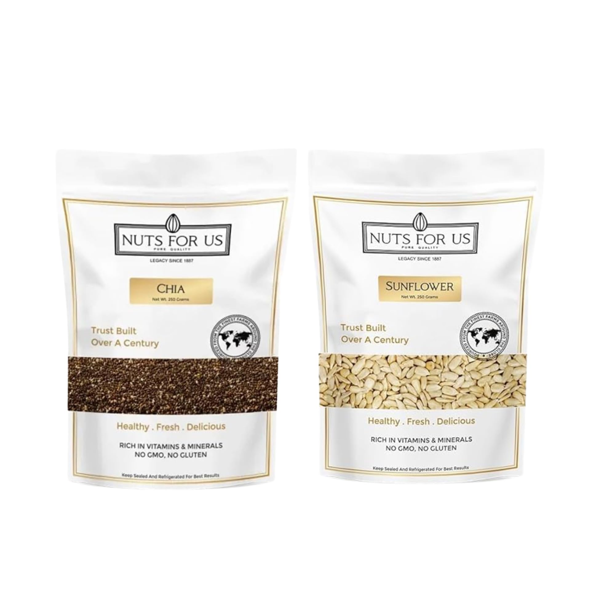Nuts for Us Chia Seeds sourced from the finest chia plants our 250-gram blend of white and golden chia seeds is designed to elevate your health and wellness. Each batch is meticulously selected and undergoes rigorous quality control to ensure you receive only the freshest most flavorful seeds. Packed with essential nutrients our chia seeds are a rich source of omega-3 fatty acids fiber protein vitamins and minerals. They support heart health enhance digestion and boost energy levels making them a perfect addition to your daily diet. The unique combination of white and golden chia seeds offers a delightful variety in texture and tasteenjoy the subtly nutty flavor of white chia or the mild sweetness of golden chia. Nuts for Us Raw Pumpkin Seeds our 250g package features unroasted pumpkin seeds packed with essential proteins vitamins and minerals that support overall health. These tiny green seeds are rich in iron zinc and magnesium making them an excellent addition to your diet. Loaded with omega-3 and omega-6 fatty acids our pumpkin seeds are not only delicious but also beneficial for heart health and reducing inflammation. The high magnesium content promotes strong bones and supports healthy bone structure while the dietary fiber helps maintain weight by keeping you feeling full longer and curbing unnecessary cravings. Nuts for Us Flax Seeds our premium 250-gram blend of white and golden flax seeds is packed with essential nutrients that promote overall health. Sourced from the finest flax plants each batch is carefully selected to ensure superior taste freshness and quality. Flax seeds are a powerhouse of nutrition rich in omega-3 fatty acids fiber protein and a variety of vitamins and minerals. These nutrient-dense seeds support heart health improve digestion and help maintain balanced energy levels throughout the day. With their delightful nutty flavor our flax seeds are perfect for enhancing smoothies oatmeal baked goods and salads. Nuts for Us Chia Seeds sourced from the finest chia plants our 250-gram blend of white and golden chia seeds is designed to elevate your health and wellness. Each batch is meticulously selected and undergoes rigorous quality control to ensure you receive only the freshest most flavorful seeds. Packed with essential nutrients our chia seeds are a rich source of omega-3 fatty acids fiber protein vitamins and minerals. They support heart health enhance digestion and boost energy levels making them a perfect addition to your daily diet. The unique combination of white and golden chia seeds offers a delightful variety in texture and tasteenjoy the subtly nutty flavor of white chia or the mild sweetness of golden chia. Nuts for Us Sunflower Seeds 250-gram premium sunflower seeds is bursting with essential vitamins minerals and nutrients that provide a plethora of health benefits. These seeds are rich in vitamin E magnesium selenium and other vital nutrients that support overall well-being and contribute to a healthy lifestyle. Sourced from non-GMO pla