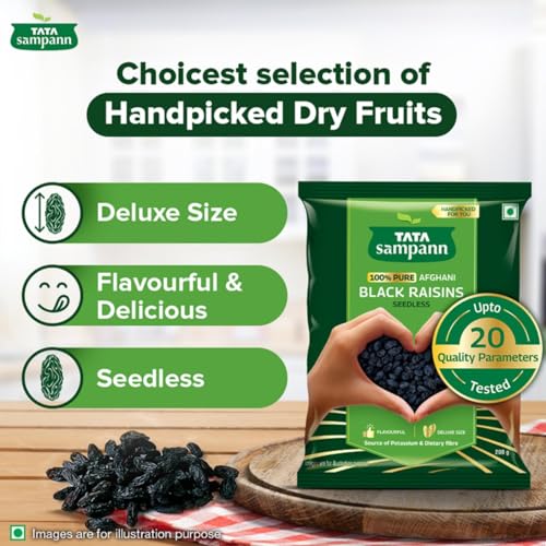 • 100% Pure Afghani Black Raisins: Take your taste buds on a delightful journey with Tata Sampann 100% Pure Afghani Black Raisins Seedless