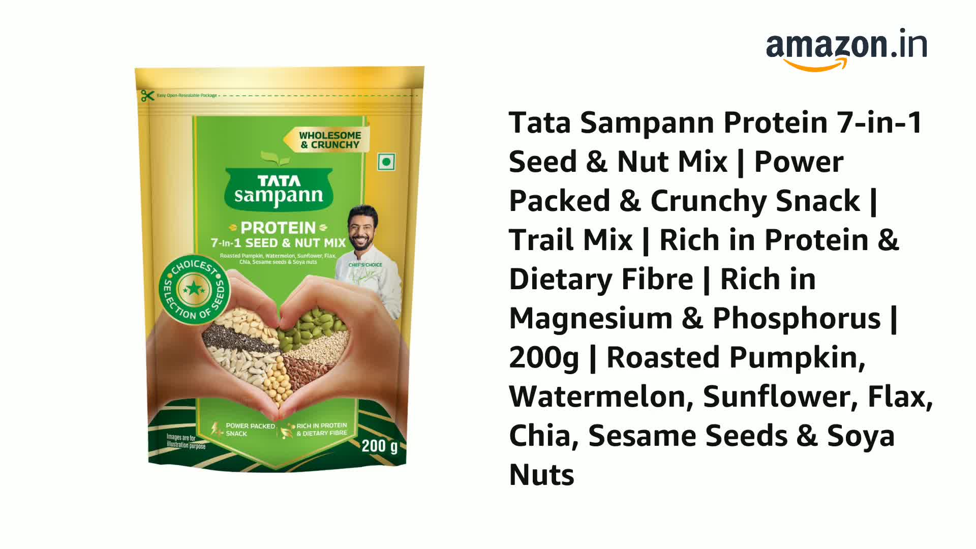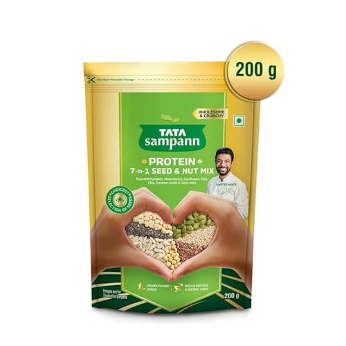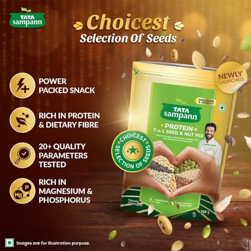 Snack On Crunchy & Wholesome Roasted Seed and Nut Mix! Indulge in the irresistible delight of Tata Sampann Protein 7-in-1 Seed & Nut Mix. Enjoy the delicious wholesome and crunchy snacking options for you. This power-packed roasted nut and seeds mix undergoes 20+ quality parameter checks to ensure you get only the premium quality. Snack on this delicious roasted nut and seeds mix combo that is rich in Protein Dietary Fibre Magnesium and Phosphorus. This roasted nut and seeds mix consists of roasted Pumpkin Watermelon Sunflower Flax Chia Sesame Seeds & Soya Nuts. Enjoy the choicest selection of roasted seeds and nut mix for breakfast mid-day snacking or on-the-go snacking. Elevate your snacking game with Tata Sampann Protein 7-in-1 Seed & Nut Mix today! Storage Instructions: Store in a cool and dry place. Store away from direct heat or sunlight.