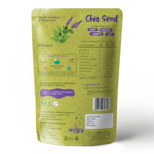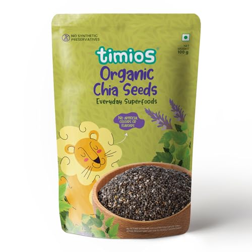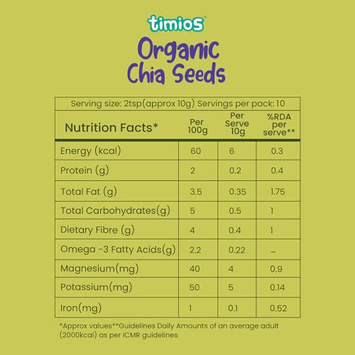 The tiny nutrition-packed “superseeds are now a staple in many health-conscious households. Thanks to their small size mild taste and versatility it easy to incorporate chia seeds into your diet. The premium quality Timios chia seeds make a beneficial addition to your snacks and meals. Packed with essential nutrients including vitamins minerals and antioxidants chia seeds deliver a nutritional value that can support optimal health. Chia seeds contain soluble fiber that bring satiety prevents overeating and benefits the overall digestive system. Timios Chia Seeds are processed & produced as per USDA standards and certified by Jaivik Bharat. Experience the goodness of Timios Chia Seeds and embrace a healthier lifestyle. These nutrient-rich seeds are a natural choice for those seeking optimal nutrition balanced well-being and a delicious addition to their daily diet. A true superfood suitable for all ages from children to adults.