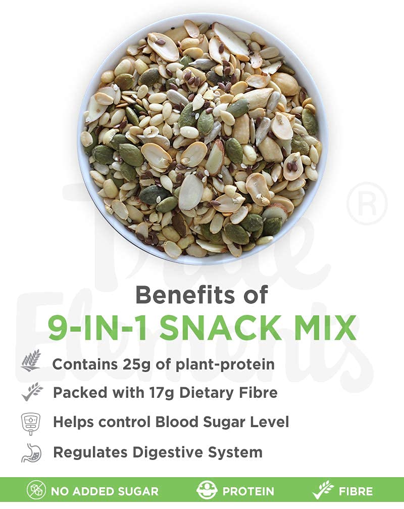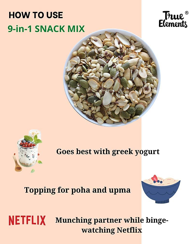 Discover the perfect snacking companion with True Elements 9 in 1 Snack Mix, conveniently available for you to Buy Snack Mix online.To increase your snacking habit, we combined the nutritious advantages of nine Super seeds and nuts in our Snack Mix. Each component is properly roasted to bring out its own flavour, taste, and health benefits. Organic almonds, chia seeds, flax seeds, and watermelon seeds are among the important components in this powerful combination. Make it a daily snacking habit and enjoy the flavour of well-being with every bite. This versatile, natural snack mix offers flavour and nutrition, so don't miss it out!