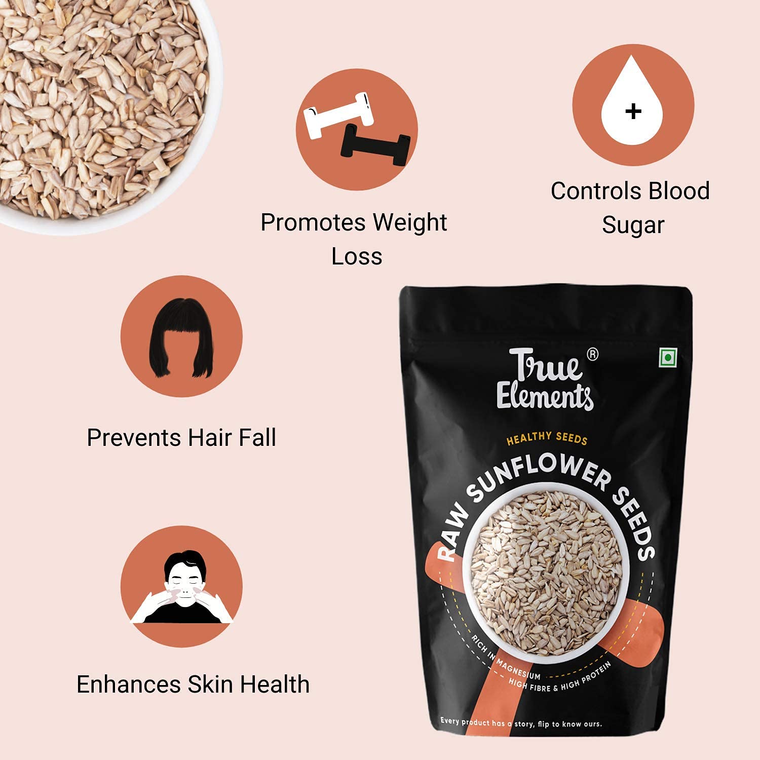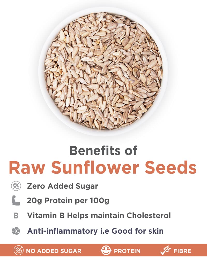 True Elements Raw Sunflower Seeds is an overall health booster for the entire body. It is an all-rounder food, which maintains the quality of the skin, improves health and nourishes hair. They possess a mild nutty taste, which is irresistible and keeps you craving for more.Our seeds make a great addition to health-conscious diets. They are rich in Vitamin E which is good for healthy skin and also good for immunity. These seeds can be helpful to enhance your hair and sleep quality due to the presence of various minerals. Also, these seeds are free from any chemicals or preservatives which makes them super healthy. These seeds are super versatile and can easily be incorporated into your daily diet. Eat it with your favourite breakfast like oatmeal, poha or upma or consume it directly as a nutrient-rich snack!