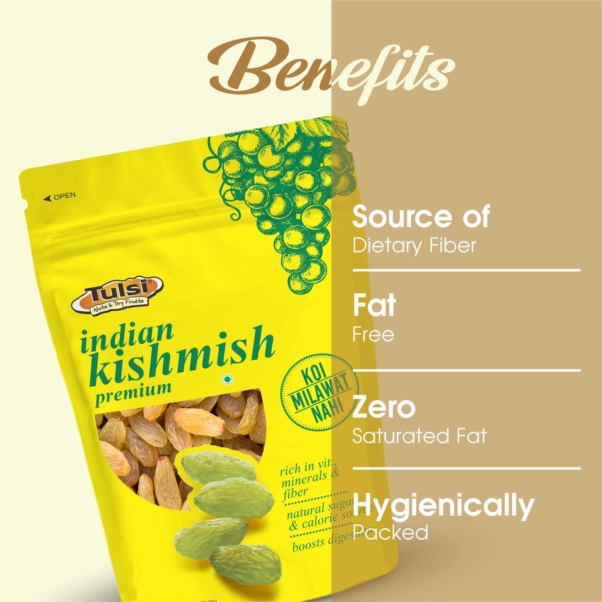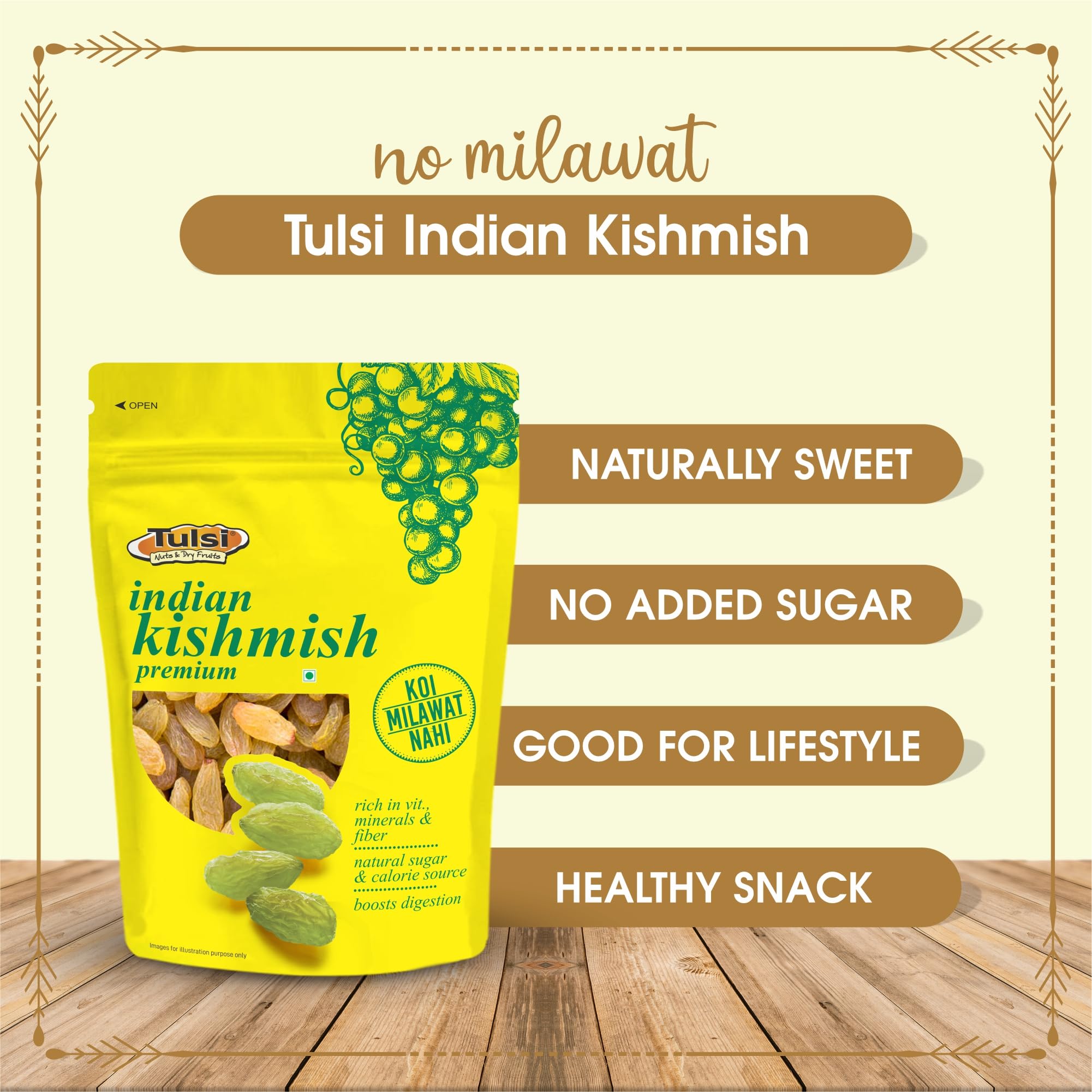 Tulsi Kishmish Indian is an extremely delicious and widely popular variety of dry fruits. Kishmish/ Raisins are dried grapes/currants. However unlike fresh grapes they indeed are rich and concentrated sources of energy vitamins electrolytes and minerals. On a weight per weight comparison basis 100 g of dried grapes hold 249 calories; several times more fiber vitamins minerals and polyphenol antioxidants than the fresh grapes .They are loaded with an array of nutrients like vitamins minerals and antioxidants. They help to reduce cholesterol. Like most dried fruits kishmish are considered a dense source of energy. These are relished by children and grownups alike. They are a suitable alternative to candies and chocolates because of their delicious sweet taste. Can be used in desserts cookies pies puddings as well as savory dishes. Tulsi is a premium flavored nuts and dry fruits brand. Tulsi has pioneered a new and yummy way to consume the daily dose of healthy nuts and dry fruits. At Tulsi we bring the taste and health together in a single pack in the finest of packing. We believe in serving the best products to our customers and hence we travel across the world to procure the finest nuts and dry fruits. Our products are processed and packed in FSSC: 22000 & HACCP certified plant The best among food safety ratings and certified by FSSAI.