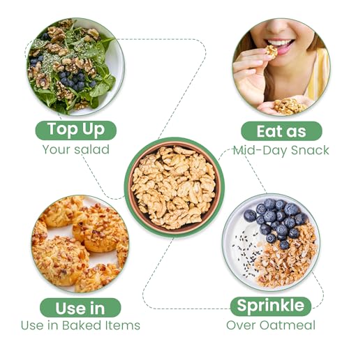 • They are considered "brain food" due to its high levels of omega-3.;RICH IN NUTRIENTS: Rich source of Antioxidants Alpha-Linolenic Acid (ALA).. 100% CALIFORNIA WALNUT KERNELS: Handpicked fresh good sized crunchy and wholesome raw akhort giri