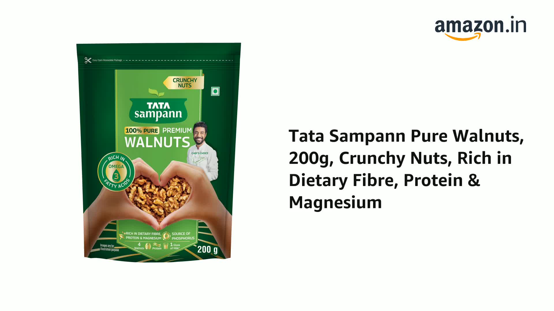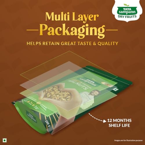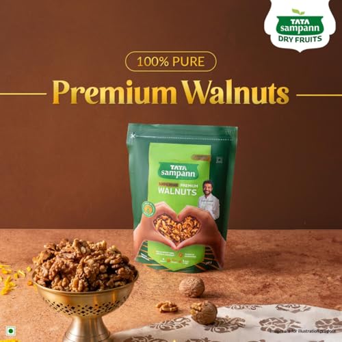 Tata Sampann Pure & Premium Walnut Kernels Tata Sampann brings you a whole range of premium dry fruits nuts and raisins for a wholesome snacking experience. With the choicest selection of nuts Tata Sampann Premium Walnuts are worth savouring. Tata Sampann dry fruits go through up to 20 quality parameters to deliver the choicest selection of nuts. Good choice for your well-being Packed with the goodness of protein magnesium phosphorus and dietary fibre Tata Sampann walnuts are a good choice for your well-being. They are rich in dietary fibre which is good for the gut. Rich in omega-3 fatty acids protein which is essential for muscle maintenance and magnesium which contributes to the maintenance of normal bones. Akhrot giri is a superfood and a source of phosphorus which contributes to normal energy-yielding metabolism. So satiate yourself guilt-free with this fulfilling snack or share it with your loved ones. Protein equivalent of 1 glass milk: 4 walnuts provide protein equivalent to 1 glass of milk* making it a choicest/great choice breakfast add-on for the family. Happy snacking! Turn your snack time delicious and wholesome with this crunchy akhrot giri. make for a great addition to your diet. Add these premium walnuts to your cooking practices and upgrade your favourite dishes to yummy delights. Walnut kernels can be consumed in the morning by soaking them overnight or as a nutritious snack in the evening. Storage Instruction: Store in a cool & dry place away from direct sunlight and moisture *4 Walnuts is approx. 30 g and 1 glass of milk (cow) is approx. 100ml. Indian Food Composition Tables 2017 â