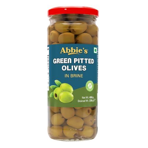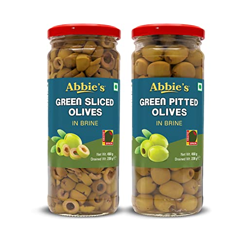 Abbie's Green Sliced Olives + Green Pitted Olives 450g, Pack of 1 each, For Authentic Taste in Cooking, Snacking, Pizzas toppings or Italian Pastas Ingredient