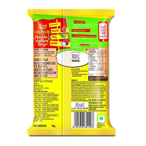 India's favourite Masala Noodles MAGGI 2-minute Noodles now comes with the goodness of Iron. Each portion (70g) of MAGGI Masala Noodles provides you with 15% of your daily Iron requirement (*as per the Daily Dietary Allowances for an Adult Sedentary Male (ICMR 2010). Containing your favourite masala taste MAGGI noodles are made with the finest quality spices and ingredients. Make your bowl of MAGGI even better by chopping up some vegetables dropping in an egg or throwing in your favorite ingredients. Usage Instructions: Prepare a delicious meal in just 2 minutes with MAGGI Boil 1½ cup of water and add the TASTEMAKER along with the noodle cake broken into 4. Cook for 2 minutes in open pan while you stir occasionally. Do not drain the remaining water. Store any remaining MAGGI noodles in an airtight container to retain freshness. Serving Instructions: Garnish with your favourite veggies and serve hot. Storage Conditions: Store in a cool dry and hygienic place to protect from insects pests and strong odours. Customer might either receive me-time treat recipe or easy-peasy recipe .