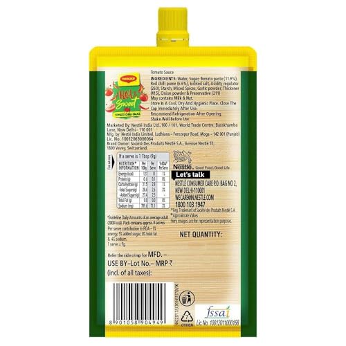Nestle brings to you MAGGI Hot & Sweet Tomato Chilli Sauce to add a delicious and spicy tang to your favourite dishes. The unique blend of this tomato sauce with tangy tomatoes and red chillies makes for a spicy and tangy flavour. The hero to your snacks and the best accompaniment to a boring meal MAGGI Chilli Sauce goes well with everything from samosas noodles to pakodas and plain chapatis. This MAGGI Hot & Sweet Tomato Chilli Sauce is made with tomatoes and a combination of spices to create a lip-smacking flavour which everyone loves. Great with snacks like burgers fries pizza pasta and more MAGGI Tomato Chilli Sauce is fresh and healthy.