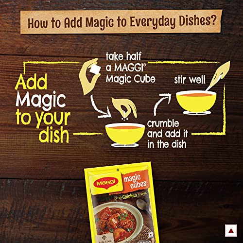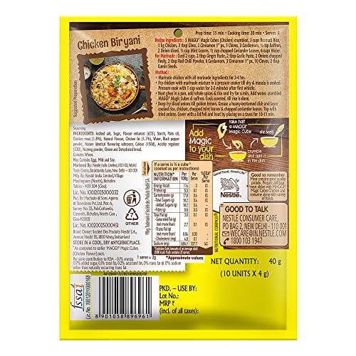 Now add a brilliant magical taste to your every day homemade non-vegetarian dishes like chicken fried rice chicken soups chicken biryani chicken curries egg curry chilli chicken chicken manchurian chicken pasta etc. with MAGGI Magic Cubes. These versatile cubes are made using carefully selected ingredients spices and herbs that have been perfectly blended to give a rich delightful taste color and aroma to any dish you prepare. Storage: Store in a cool dry and hygienic place.