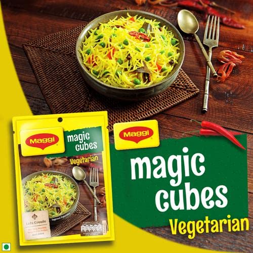Now add a brilliant punch to your everday homemade dishes like rice vegetables soups dals etc. with MAGGI Magic Cubes. These versatile Cubes are made using carefully selected ingredients spices and herbs that have been perfectly blended to give a rich delightful taste color and aroma to any dish you prepare. Using MAGGI Magic Cubes is as easy as crumbling and adding to your dish. So go ahead and try these Cubes in your Veg Fried Rice or Veg Pulao today and taste the difference! This pack contains 60 individually wrapped pieces inside to retain the freshness of each Cube.