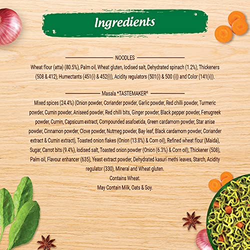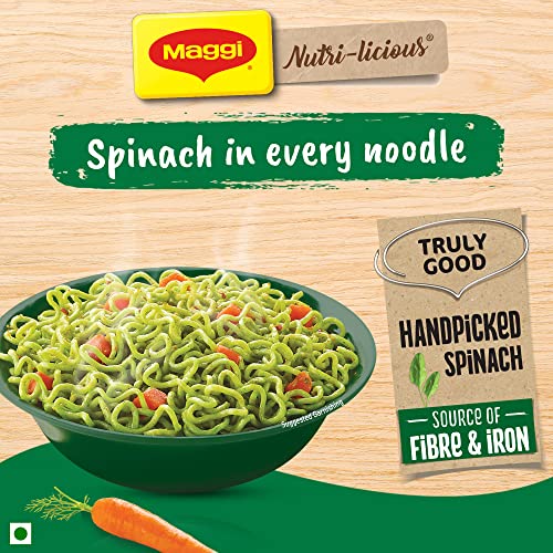 Maggi veg atta Now with the awesome surprise of spinach in every noodle'' introducing new Maggi nutritious masala veg atta noodles with spinach in every noodle. It has an appetizing aroma and delicious masala taste made using 20 spices & herbs. These Maggi nutritious masala veg atta noodles with spinach in every noodle are a truly a good combination of delicious and tasty wheat flour (atta) spinach colourful vegetables & 20 spices & herbs. Also loaded with the goodness of wheat each meal is deliciously filling. Each serve (72.5g) of the Maggi masala veg atta noodles with spianhc in every noodle is a source of fibre & iron (refer pack for more details). making Maggi nutritious masala veg atta noodles with spinach in even noodle is as easy as it could ever be simply empty the masala tastemaker(r) sachet into 1 ½ tea cups (225 ml) of boiling water add the noodles cake & stir. Cook for 3 minutes and wait for your favourite "surprisingly awesome" Maggi masala veg atta noodles. In just 3 minutes Now you can enjoy a balance of taste & health at anytime of the day! Enjoy your Maggi noodles (steamed dried and fried) and consume a variety of other foods like vegetables fruits and milk.