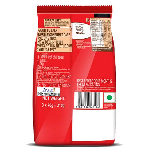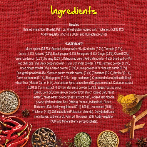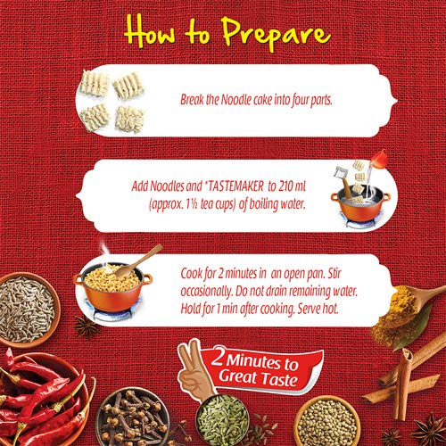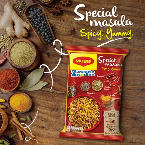Nestle Maggi 2-minutes masala noodles have been a classic Indian snack since more than a decade. To take your favourite masala taste experience to the next level Maggi introduces the new Maggi special masala noodles a recipe of 20 spices and herbs that provides a more redefined Maggi masala experience. Made with a blend of finely ground and whole spices and herbs the all new Maggi instant noodles have an extra special and flavourful tastemaker sachet inside. These spices have been roasted to perfection providing a distinct aroma and colour to your Maggi noodles. The good Maggi taste also comes fortified with iron and provides 15 percent of your total iron need per day. The pack contains a single noodle cake and a tastemaker.