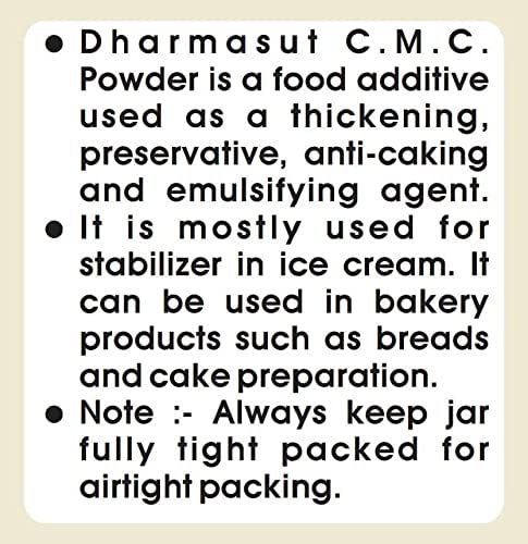 Dharmasut CMC Powder is a thickening agent that can be used to make ice cream frozen yogurt and other desserts. CMC powder works by absorbing water from the surrounding environment and increasing the thickness of the product. It also improves mouthfeel by providing a firm yet smooth texture to your food products. CMC powder is widely used in ice cream baking breads and cakes.