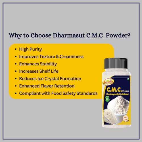 Dharmasut CMC Powder is a thickening agent that can be used to make ice cream frozen yogurt and other desserts. C.M.C. powder works by absorbing water from the surrounding environment and increasing the thickness of the product. It also improves mouthfeel by providing a firm yet smooth texture to your food products. CMC powder is widely used in ice cream baking breads and cakes.