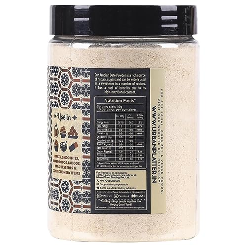 Urban Platter Dried Date Powder Is A Natural Antioxidant Natural Sweetener Rich Source Of Iron Calcium Vitamins. Dry Date Powder Is Low In Fat Cholesterolfree Low Sodium High Potassium Content.Our Date Powder Is Made From Pure Dried Dates And Is Finely Ground For A Great Baking Experience!Include Date Powder In All Your Dishes Pancakes Muffins Cakes Cookies Puddings Kheer Sweets Grainfree Baking Mixes For A Natural Nutritional Sweet Flavour Texture. In Cool And Dry Place Avoid Using A Wet Spoon To Handle This Product. Comes In A Handy Zipper Standup Pouch. Processed In A Facility That Handles All Types Of Nuts.Urban Platter Simply Good Food! :)