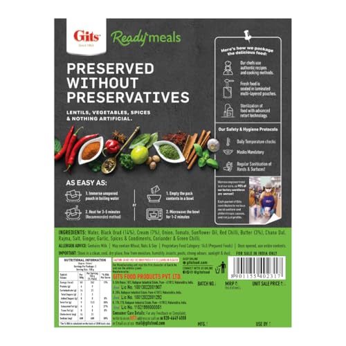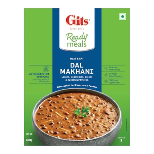 The rich and creamy Indian delicacy of Dal Makhani is loved by all with much joy. The combination of ingredients like black dal kidney beans and bengal gram can produce really mouth-watering results. These black grams and beans are cooked with the best Indian spices in a rich tomato onion gravy and then slow cooked for over 12 hours on a tandoor. The Gits Ready to Eat Dal Makhani is an authentic and wonderful meal addition on those days when you need a ready to eat meal. It comes in a container that preserves freshness for a year. All you have to do is heat it up in the microwave or boil the unopened packet in some hot water. Within a few minutes you will have dal makhani that goes well with pulao rotis and other Indian breads. On special occasions festivities and family gatherings when you have very limited time to cook the Gits Ready to Eat Dal Makhani comes in very handy! Gits has been leading the ready meals market for over fifty years and touching the lives of Indians across the world with its wide range of products.