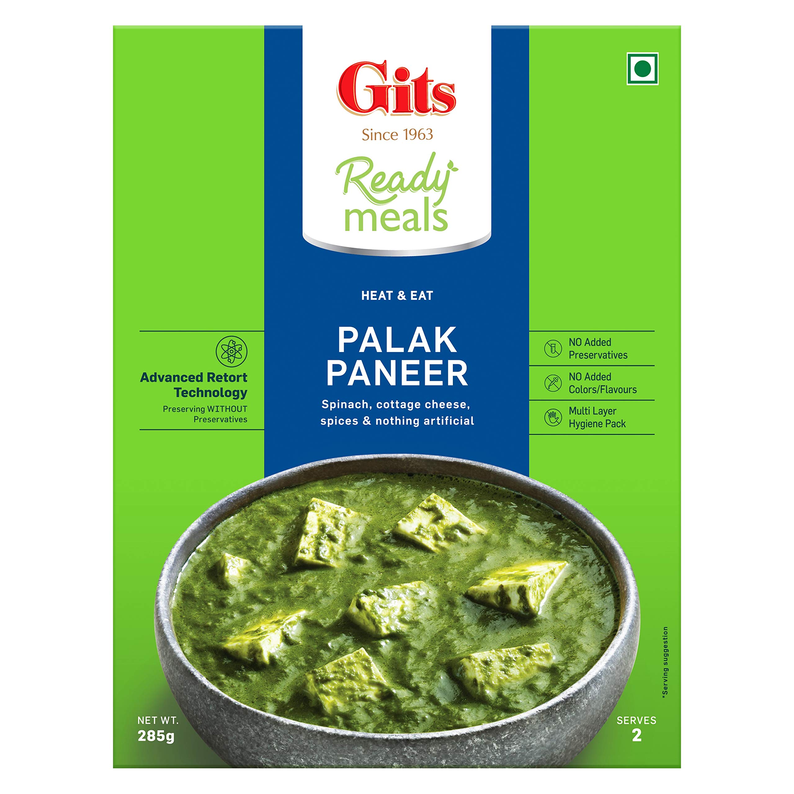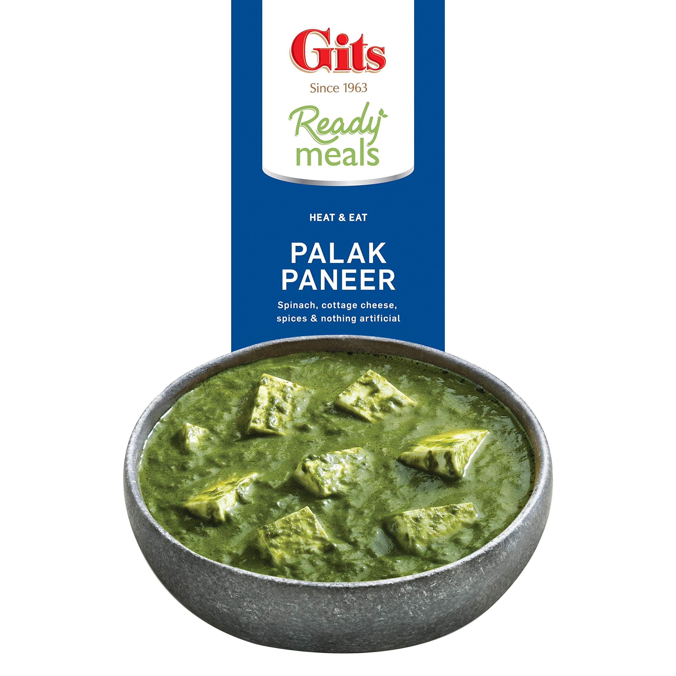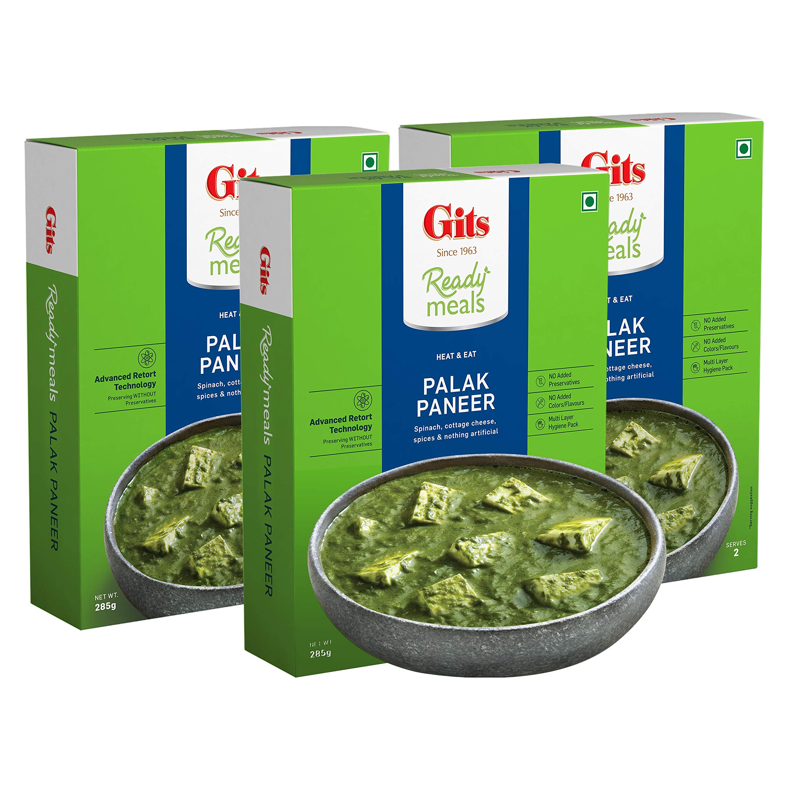 Gits Ready to Eat Palak Paneer Pure Veg Heat and Eat Indian Dish Microwaveable 855g (Pack of 3 X 285g Each)