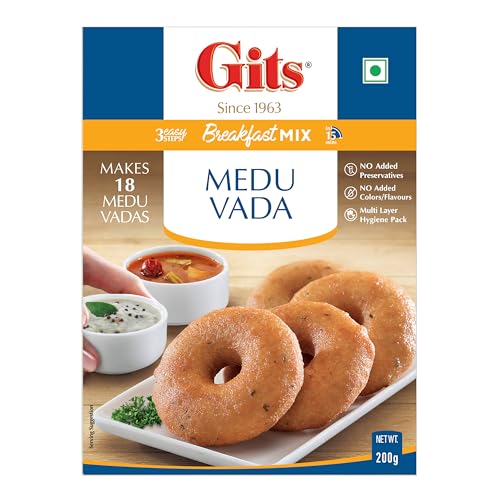 Gits Breakfast Medu Vada Mix 200g X 4 = 800g - Medu vada is a south Indian fritter made from urad dal. It is usually made in a doughnut shape with a crispy exterior and soft interior. It is popular food item generally eaten as a breakfast or a snack.