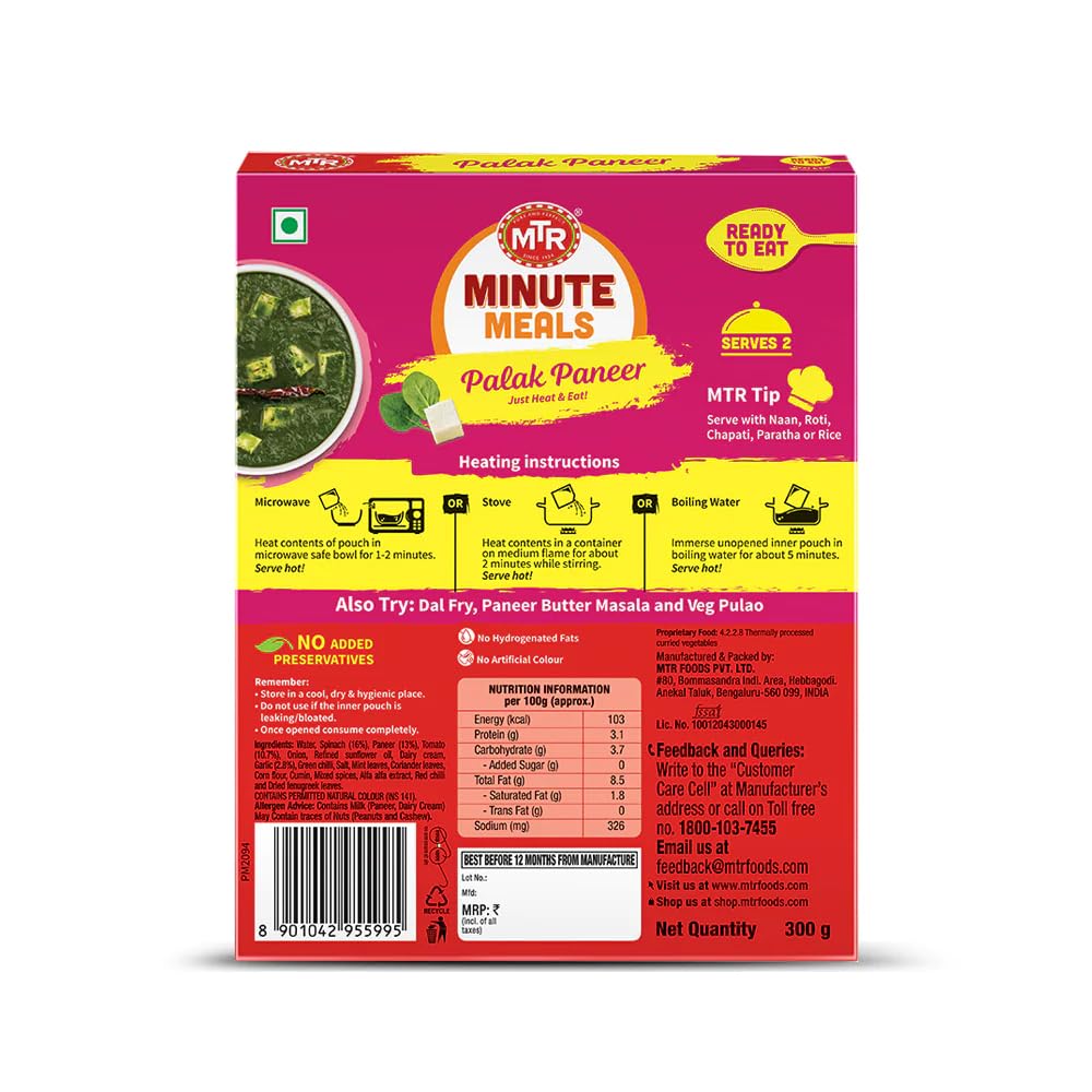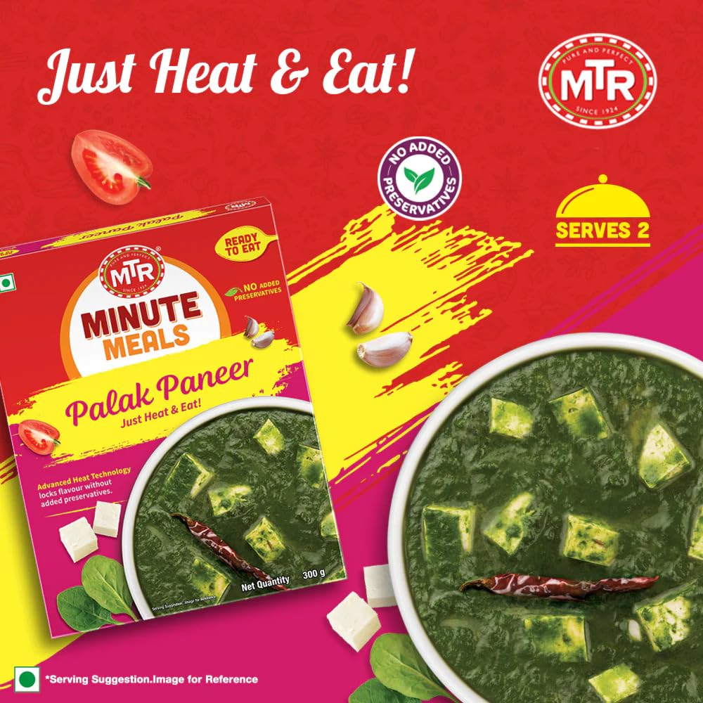 The instant and quick hunger reliever that comes in a hygienically processed packets offers the best treat to the vegetarians. MTR ready to eat palak paneer consist of tender chunks of cottage cheese in a fresh green spinach gravy ideal for serving or consuming with naan roti chappathi paratha or rice.