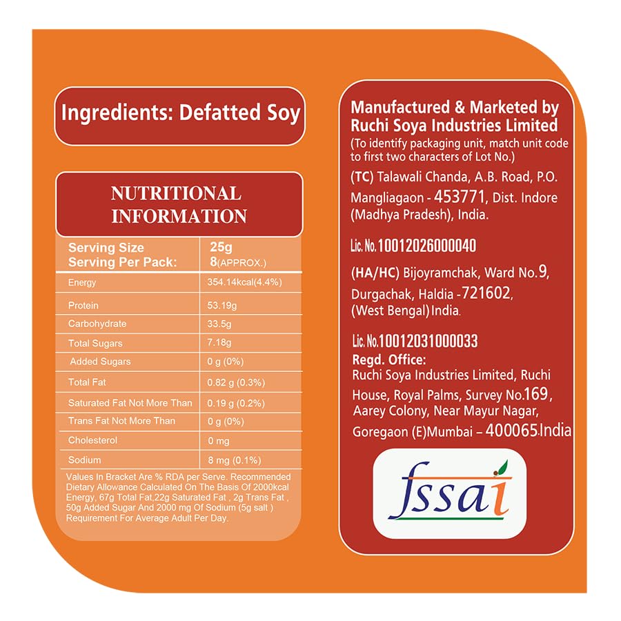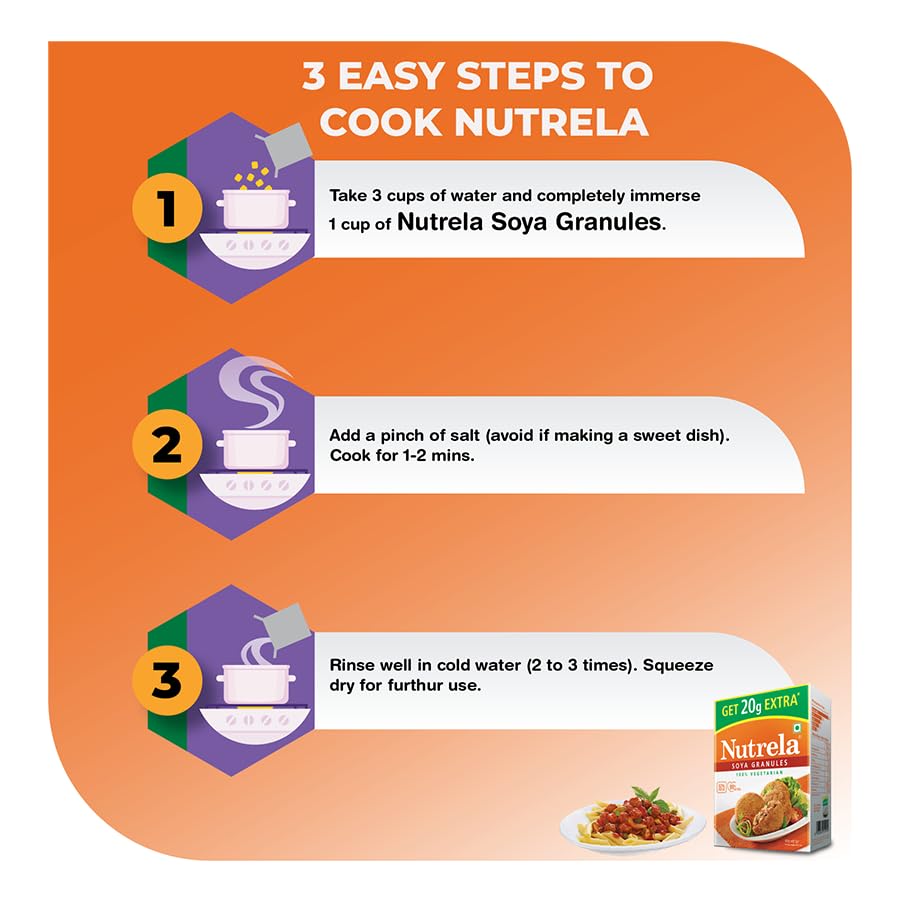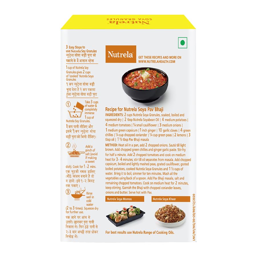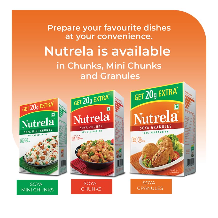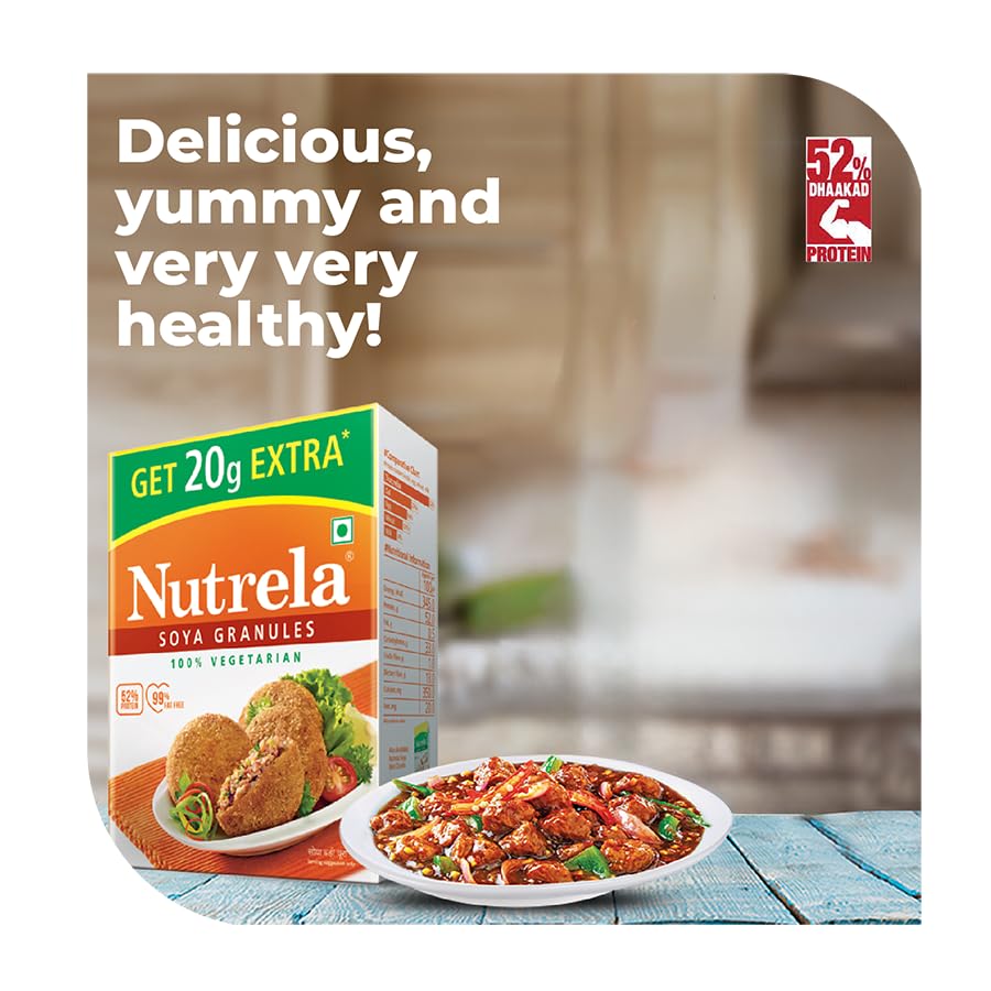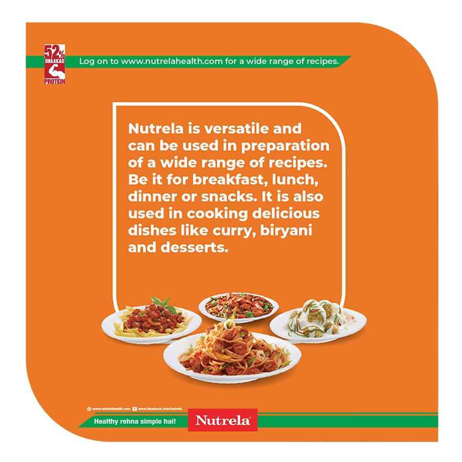 Nutrela Soya is one of the highest source of protein. It provides 52% best quality protein which is far higher than any other known sources of protein like Egg or Milk or Dal . We call it "Dhaakad Protein". It is also a good source of iron and calcium. Nutrela Soya is the most versatile ingredient in your kitchen add it with any dish and gift yourself a healthy diet.