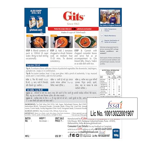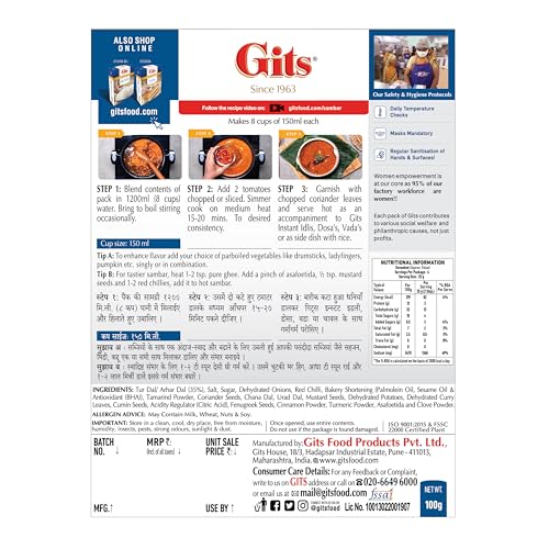 Item arrived on time. Gits branded Ready-to-eat products are generally good in my opinion. This Sambar stays true to that statement. It is a good mixture of the required Dhals and spices and coupled with some onions and tomatoes it produces very good quality sambar in about 10-15 mins. All of us in the family like it!