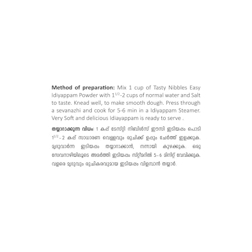 Method of preparation: Mix 1 cup of Tasty Nibbles Easy Idiyappam Powder with 11/2-2 cups of normal water and Salt to taste. Knead well to make smooth dough. Press through a sevanazhi and cook for 5-6 min in a Idiyappam Steamer. Very Soft and delicious Idiayappam is ready to serve.
