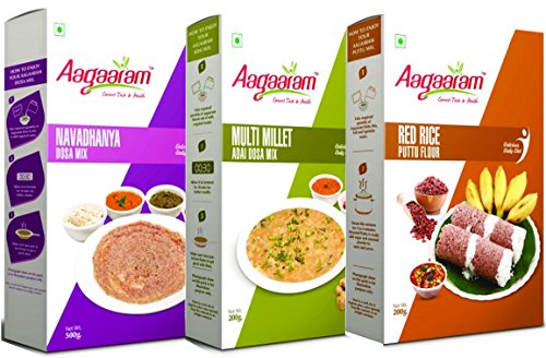 Package Contents: 1 Adai Dosa Mix 200 grams 1 Navadhanya Dosa Mix 500 grams 1 Red Rice Puttu Flour 200 grams