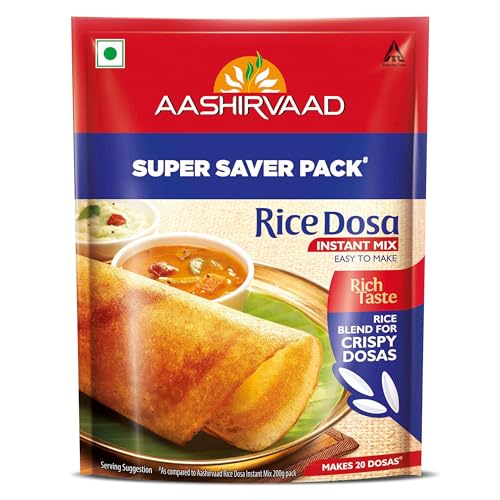 Launched in March 2006 Aashirvaad Instant Mix range promises discerning Indian homemakers authentic tasting dishes that are easy to make.Savour the all-time favourite South Indian dish with Aashirvaad Instant Mix Rice Dosas. Relish it as a yummy breakfast or a delicious meal or as a quick snack anytime you want. Because all you have to do is follow 3 quick and easy steps and voila! Tasty and healthy Rice Dosa are ready easily.Enjoy crispiest dosas every time as the instant mix includes rice flour and urad dal. Each pack of Aashirvaad Instant Mix can make 20 Rice Dosas. So store it in a cool dry place and you can use it repeatedly over a period of time.Convenient to make and authentic in taste Aashirvaad Instant Mix range also includes the decadent Indian sweet - Gulab Jamun and tasty South Indian favourites - Rava Idli and Rice Dosa.