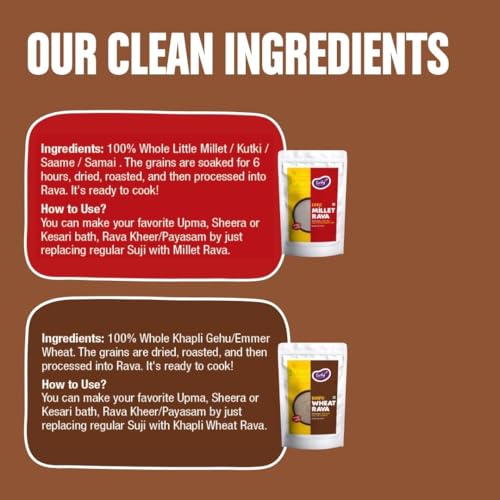 Freshly made ready to cook multipurpose Rava/dalia packs. Grandma inspired recipes simple healthy with minimal processing. Made from ancient Indian Super Foods. No added artificial flavors no preservatives. Shelf life is 4 month. No Additives. All Natural100% Whole grains. The grains are cleaned dried roasted and then processed into Rava. Contains no preservatives no added flavours. After opening this pack immediately transfer into a clean dry container. Keep it in a cool dry place or in a refrigerator. Since there are no preservatives please use it within one month or expiry date whichever is earlier.