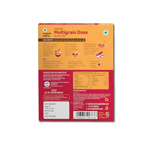 Making healthy and tastier Dosas just got easier! Organic Tattva's Organic Multigrain Dosa Mix helps you make a Delectable Meal in No Time! Moreover it is highly nutritious made with a blend of Corn Flour Jowar and Rice flour and has benefits of organic sunflower oil and natural Salt. This easy to make dosa mix is tasty healthy and perfect for you and your family. It is in an Instant and easy to cook format healthy breakfast. Prepared with the high-quality ingredients to help you add value to your food. Organic Tattva's Organic Multigrain Dosa mix is made from organic ingredients. This healthy dosa mix is based on homemade recipe and is 100% natural. Millets are gluten free fiber vitamins and minerals. Organic Multigrain Dosa mix is also a weight loss dosa mix because it will help to control your appetite. Devour it as a delightful family meal or as a snack to honor taste cravings within a matter of minutes. A convenient way of including Millets in your daily meals helping you stay fit & healthy.